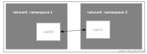 veth是虚拟以太网卡(Virtual Ethernet)的缩写。veth设备总是成对的,因此我们称之为veth pair。veth pair一端发送的数据会在另外一端接收,veth pair常被用于跨network namespace之间的通信,即分别将veth pair的两端放在不同的namespace里,如图1-2所示。