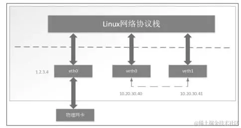 仅有veth pair设备,容器是无法访问外部网络的。因为从容器发出的数据包,实际上是直接进了veth pair设备的协议栈。如果容器需要访问网络,则需要使用网桥等技术将veth pair设备接收的数据包通过某种方式转发出去。
