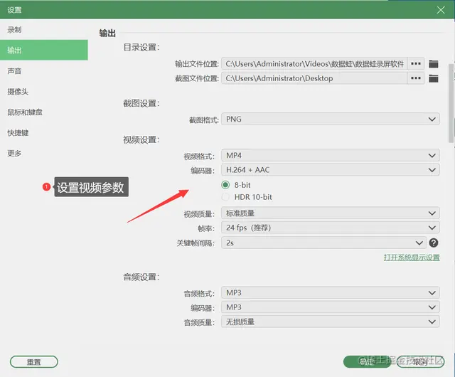 备注:点击页面右上角的【输出设置】,您可以设置视频的参数(视频默认格式为MP4;默认帧率为24fps;默认编码为H.264+ACC;默认输出质量为标准质量)。