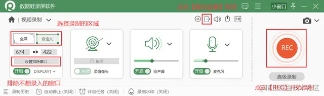 **步骤3.**在软件主界面,您可以看到多种录制模式,点击左侧的【视频录制】模式,您可以进入【视频录制】页面。接着设置录制的范围,然后点击【REC】按钮进行录制。通过点击页面右下角的【设置排除窗口】,您可以排除不想录入PPT画面的应用页面;