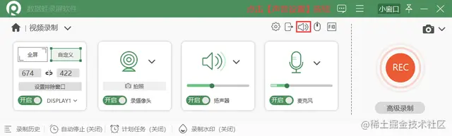 备注:需要在录制PPT页面时录入人脸,可以开启【视频录制】页面的摄像头;需要录制内部声音时,可以开启扬声器;需要录制外部声音时,可以开启麦克风。点击页面右上角的【声音设置】可以对麦克风进行增强和降噪处理。