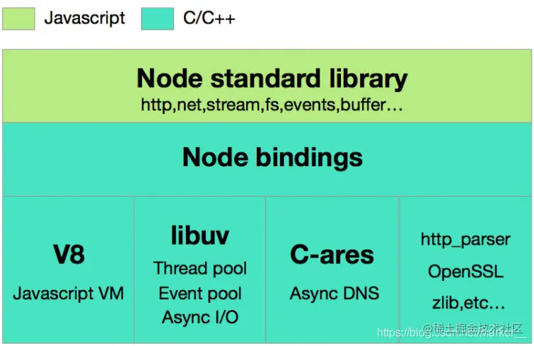 - C-ares:提供了异步处理 DNS 相关的能力。 http_parser、OpenSSL、zlib 等:提供包括 http 解析、SSL、数据压缩等其他的能力。
