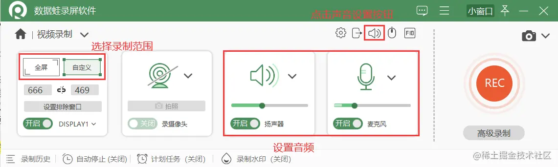 **步骤3.**点击软件主界面的【视频录制】模式,进入【视频录制】页面;如果您需要录制电脑内部声音,您可以开启扬声器;需要录制外部声音,在确保接入麦克风或者耳机后,您可以开启麦克风;点击页面右上角的【声音设置】按钮,可以对麦克风进行降噪和增强处理。然后选择录制的范围,点击【REC】按钮进行录制。