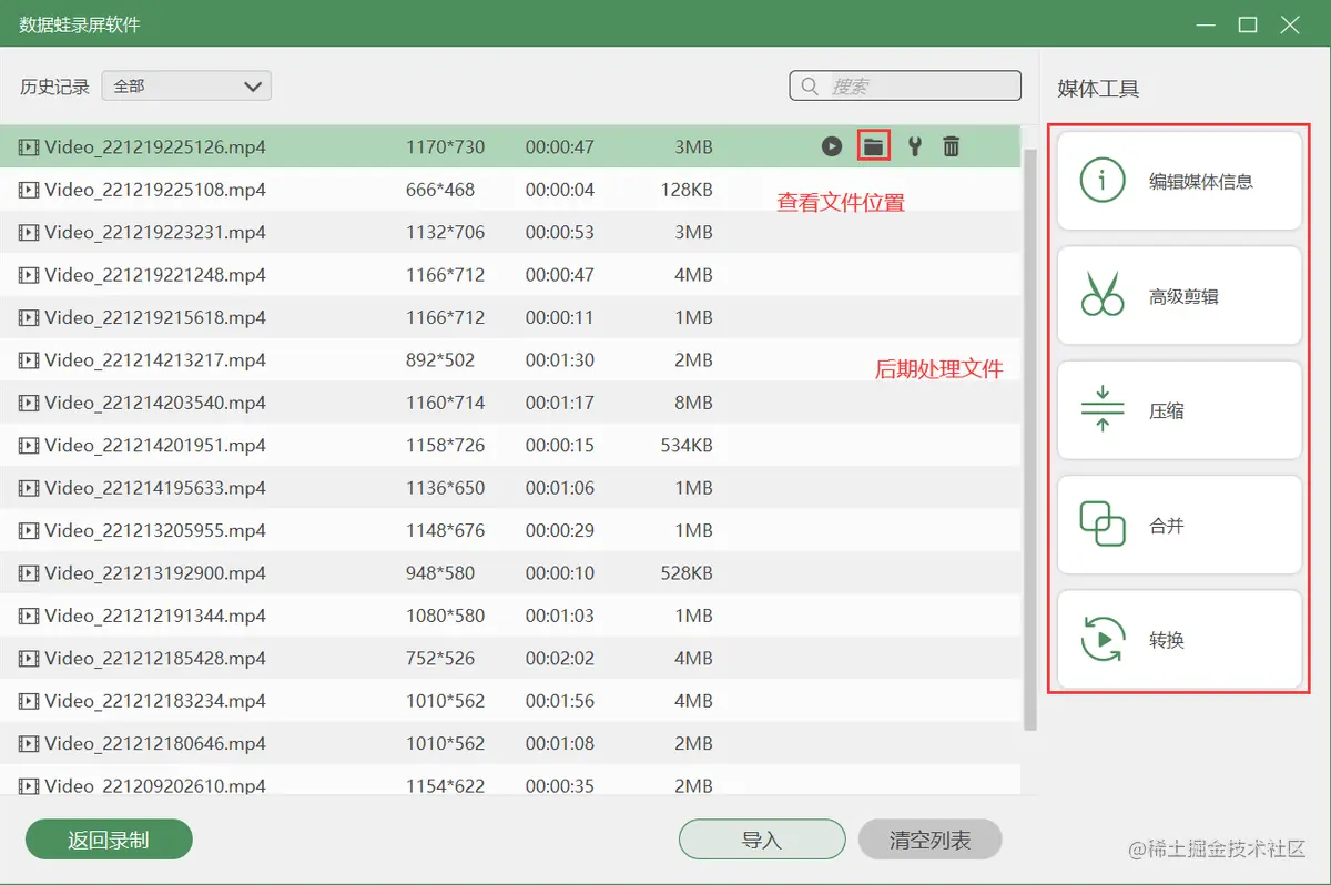 **步骤4.**录制结束后,可以对录屏文件进行适当剪辑,然后点击【完成】按钮进入【录制历史】页面,在此页面您可以使用【媒体工具】对录屏文件进行(合并、压缩、转换)等后期处理。