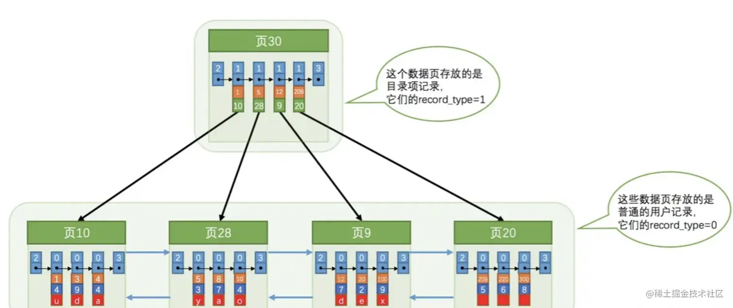从上图中我们可以看到,页30是一个目录页(可以把他当做树的根节点),页10、页28、页9、页20是真正存放数据的数据页。