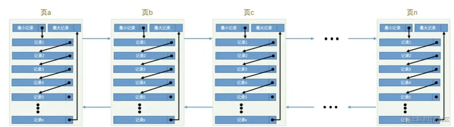从上图中我们可以看到,每个数据页都保存了很多条记录,相邻页之间还通过双向链表保存着联系。