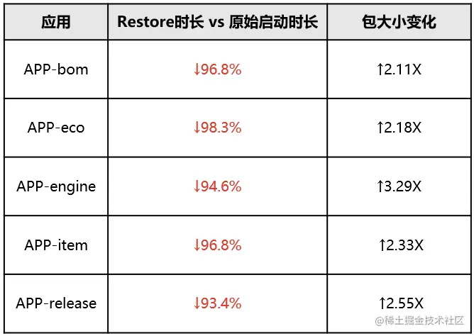 - Restore 耗时是秒级,相当于将数十秒完整的初始化时间(在图 1 的示例中)缩短至秒级 Restore 耗时,启动性能提升了一个数量级。