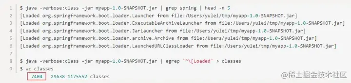 - 框架复杂:Spring作为一个企业级的框架,为了支持广泛的应用需求,存在大量的可配置和初始化逻辑,并通过复杂的设计模式来支撑这种灵活性。例如,一个spring-boot-web的hello world,依赖的class文件就多达7404个,见图2;