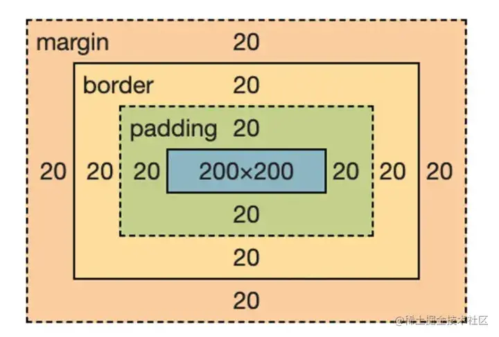 再次强调:当应用 CSS 设置一个元素的 width 和 height 属性时,只是设置了元素内容区域的宽度和高度。要计算一个元素的完整尺寸,必须要加上填充、边框和边距。