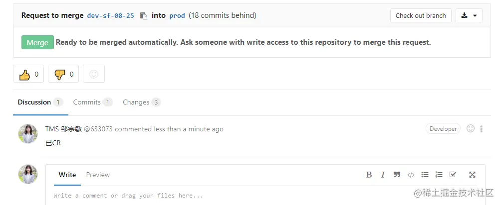 合并代码前需检查是否解决完所有CR问题、如无CR问题需评论已CR