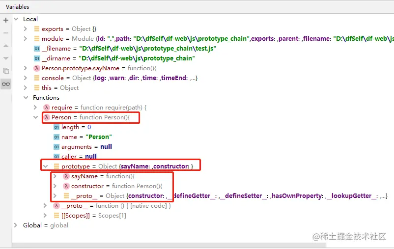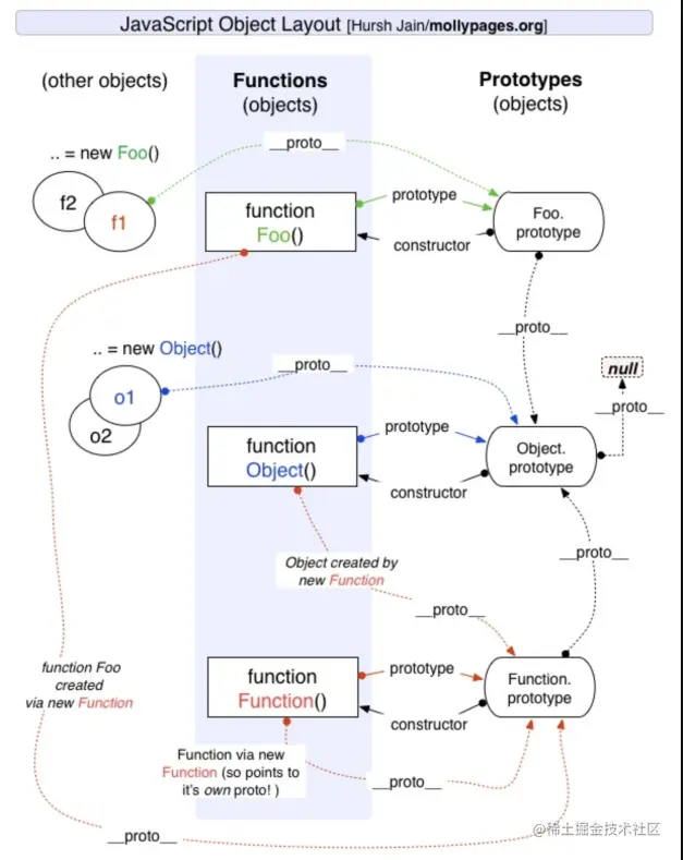每个函数都有一个原型对象,默认什么属性都没有,开发者可以自己添加。但是原型对象也有原型,默认指向根对象的原型对象,就是Object的原型对象,这上面有一些对象的属性和方法。