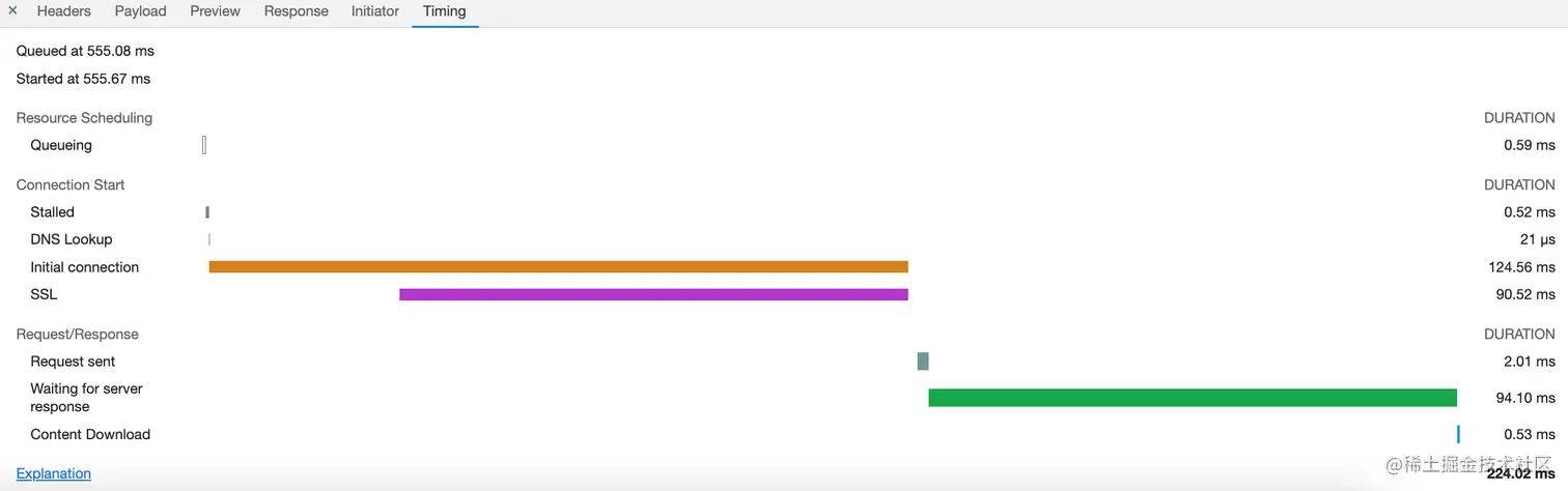 - 初始连接(Initial Connection / Connecting): 建立连接所花费的时间,包括TCP握手/重试和协商SSL。