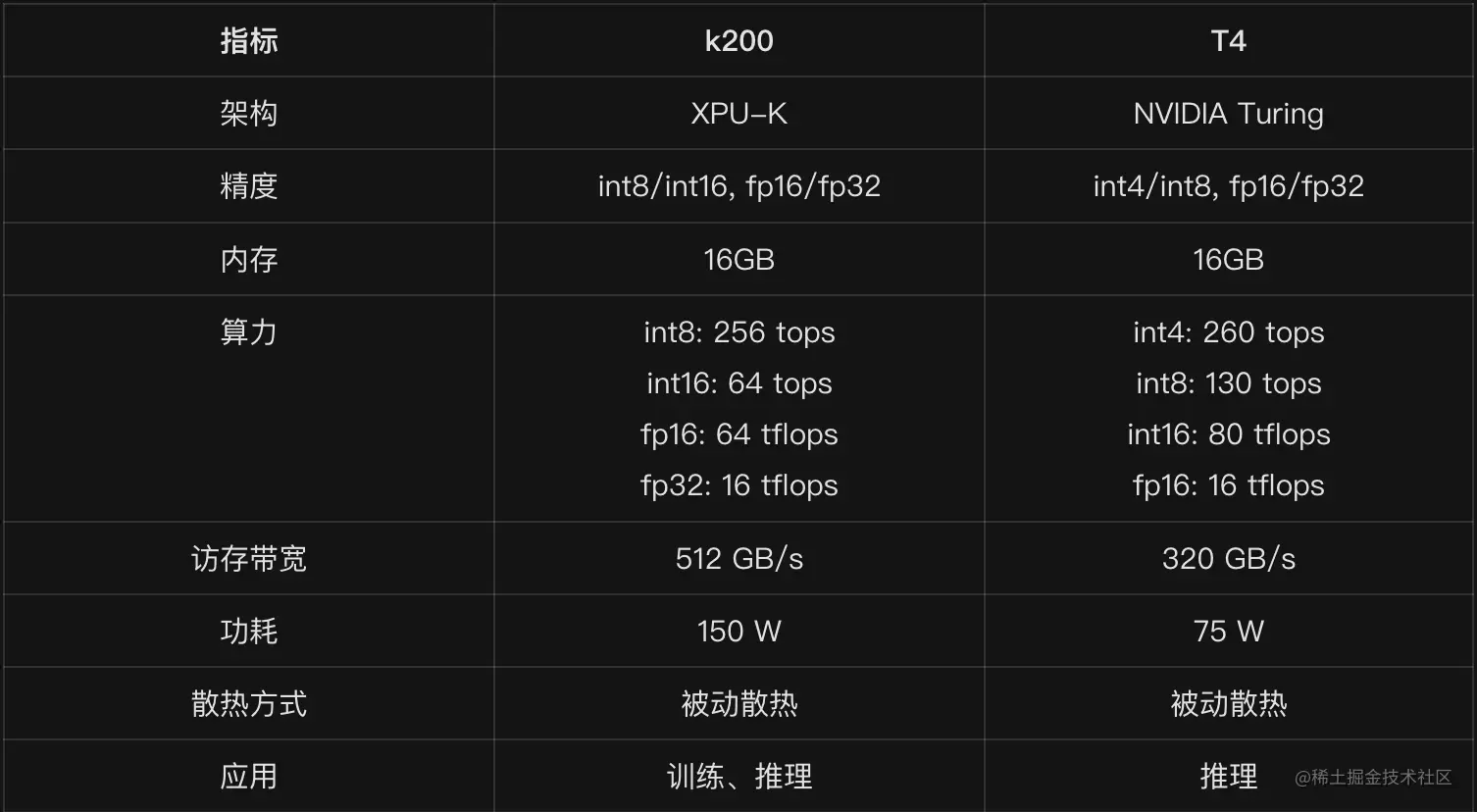 先来看看k200的性能指标 (就按前面的跟T4对比,但实际你要内心要用 "T4*2" 来对比)。