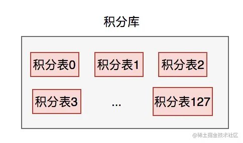 当时使用一个积分数据库就够了,但是分了128张表。然后根据用户id,进行hash除以128取模。