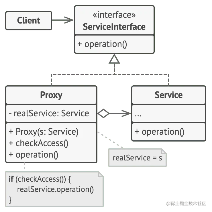 代理(Proxy)类包含一个指向服务对象的引用成员变量。代理完成其任务 (例如延迟初始化、 记录日志、 访问控制和缓存等) 后会将请求传递给服务对象。