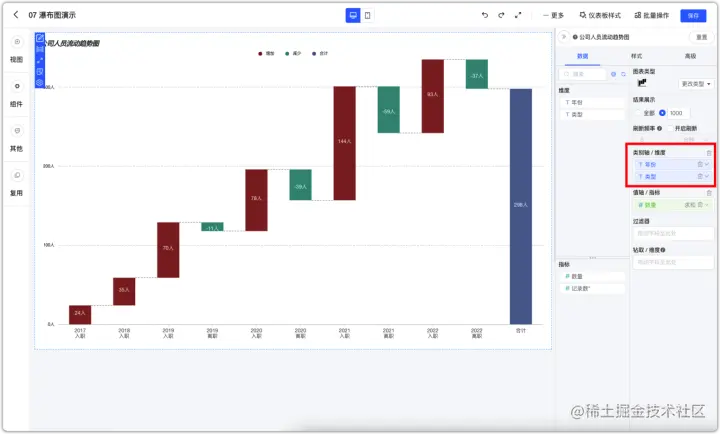 例如如下示例,展示公司每年的人员流动情况,每年的入职与离职人数变化。