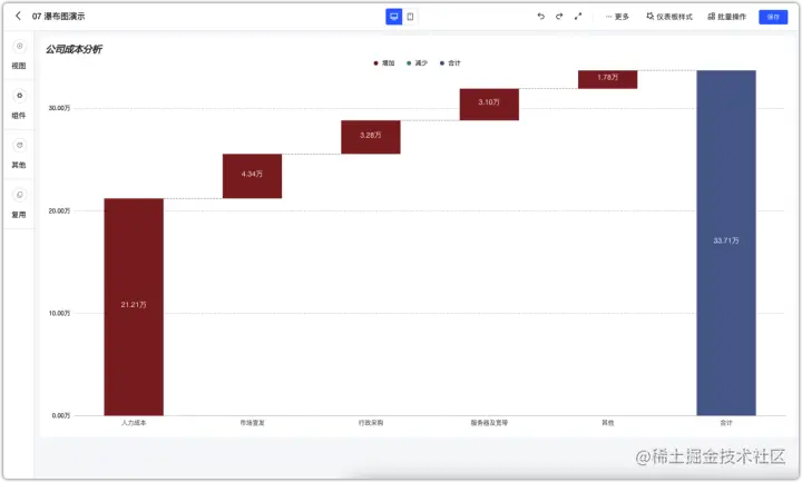 例如下图所示,展示公司各项成本支出情况,左侧各个柱子为各项子类的数值,数值越大则对应的柱子高度越高,最右侧的柱子则展示了各个子类所汇总的总数据,即公司总的支出金额。