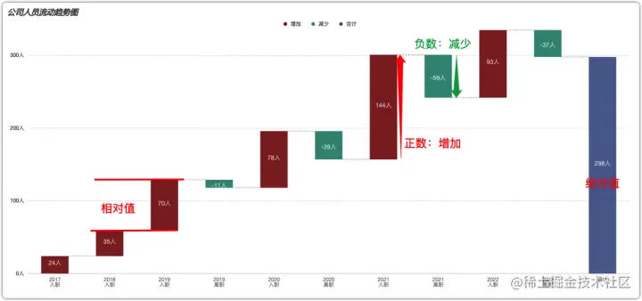 图表每个柱子的起始位置为上一根柱子的顶端,若数值增加(正数),柱子向上延伸,若数值减少(负数),柱子向下延伸。每个柱子的顶端即为当前变化情况下的最终数量,即小计,最后的柱子即为最终数据的最终数量,即总计。