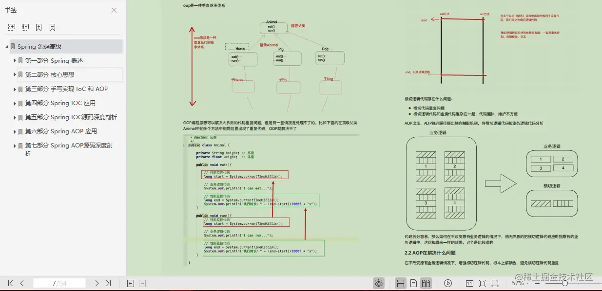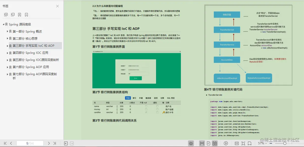 更精彩的是,后面用了很大的篇幅来解析 Spring IoC 和 Spring AOP 的基础、高级特性、源码深度剖析,非常值得一看。