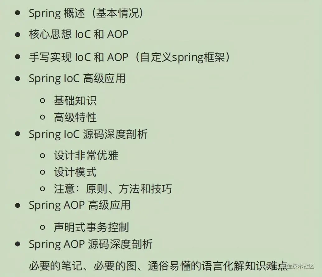 这套学习资料先从大框架开始,和你介绍Spring的核心结构,再从 Ioc、AOP 两个核心思想下手,带你一步步搞懂这两个容器解决了什么问题。