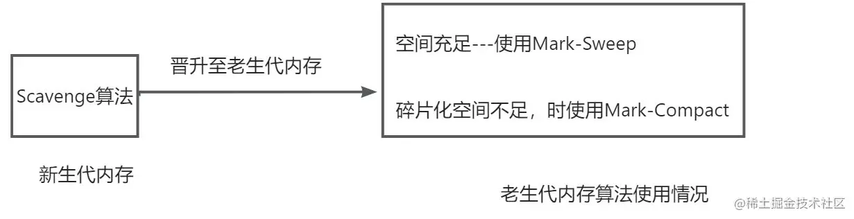 - 在默认情况下,V8 的对象分配主要集中在 From 空间中。对象从 From 空间中复制到 To 空间时,会检查它的内存地址来判断这个对象是否已经经历过一次 Scavenge 回收。如果已经经历过了,会将该对象从 From 空间复制到老生代空间中,如果没有,则复制到 To 空间中。
