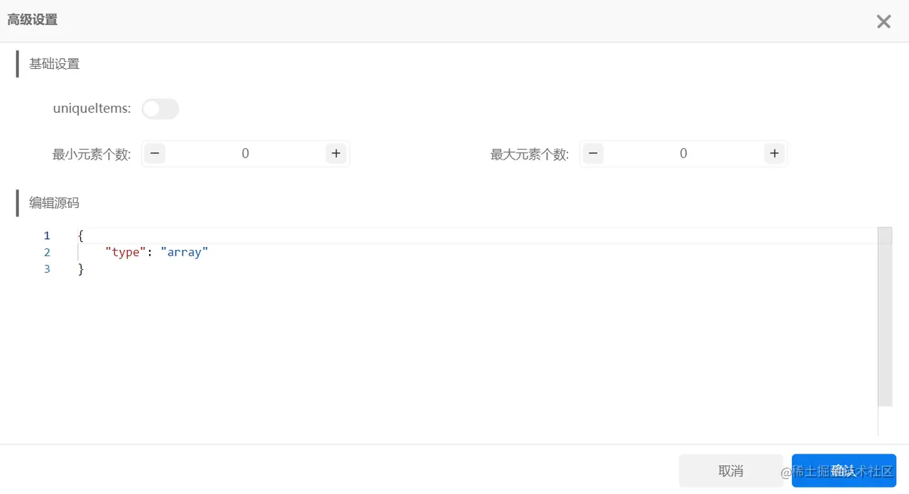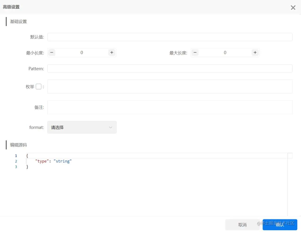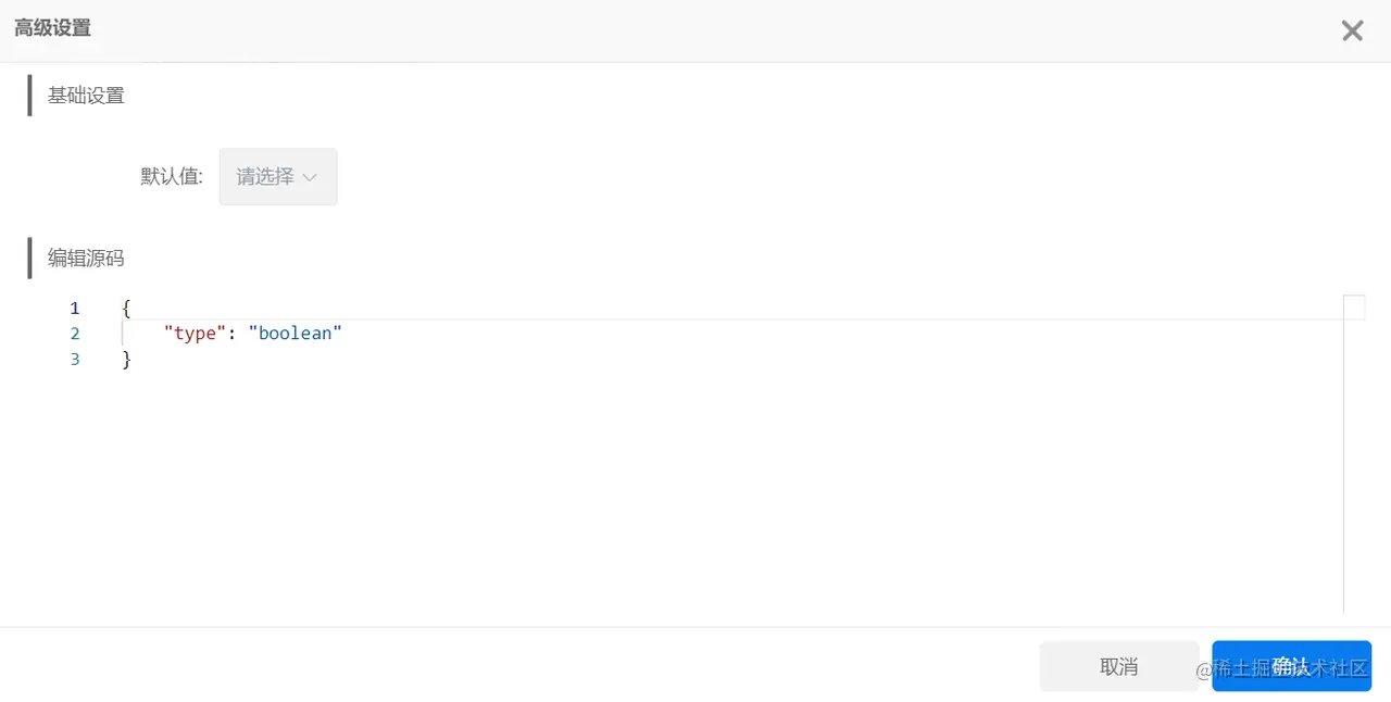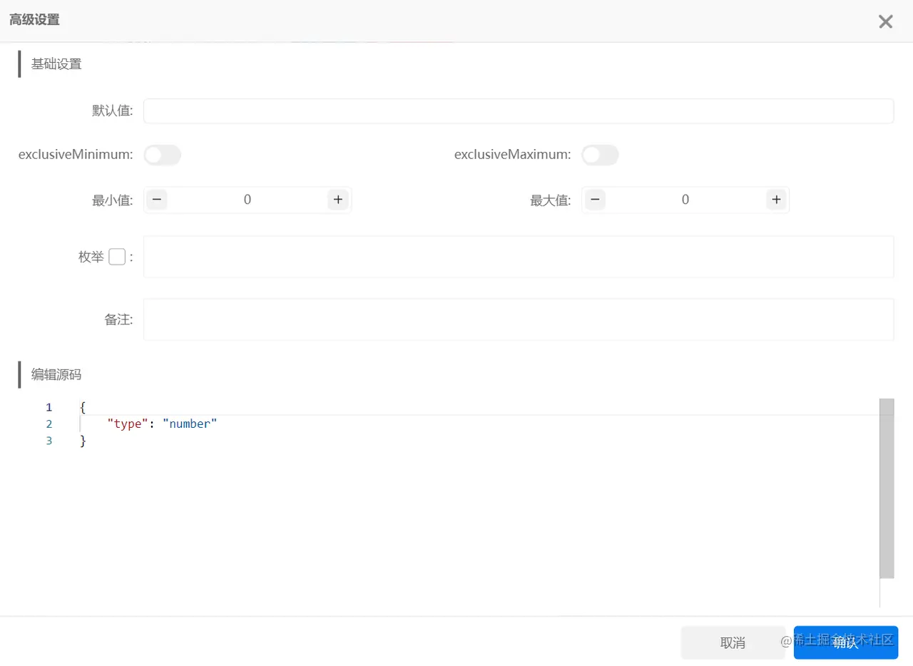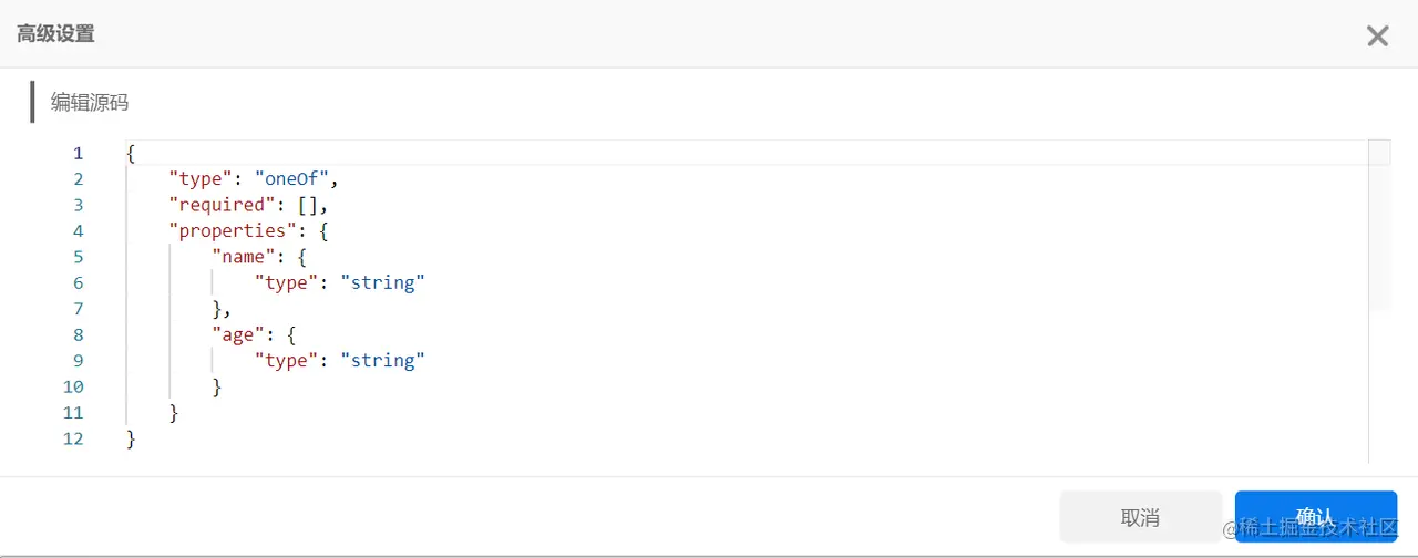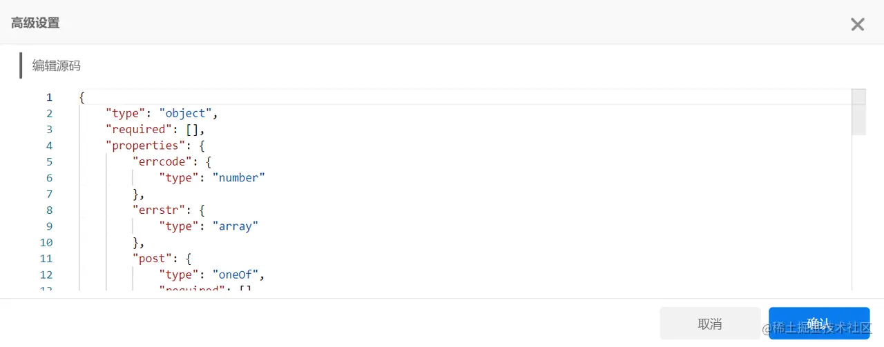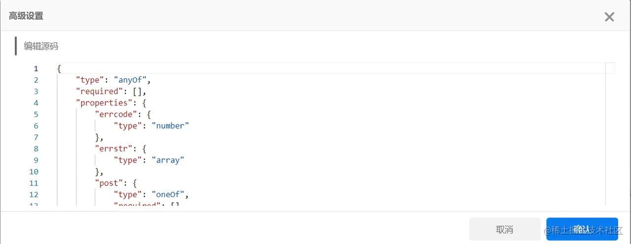 当我们选择json-schema或XML格式时,可以设置每一条字段的类型,分别为string、number、integer、array、object、Boolean、null、any八种类型,若需对该字段进行高级设置,不同的类型也对应不同的高级设置方法。
