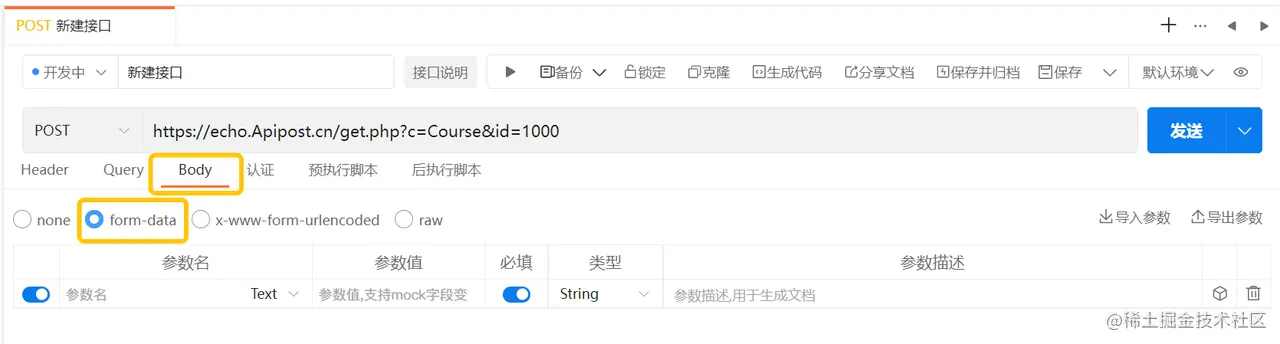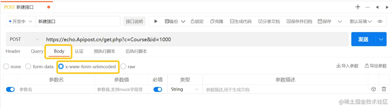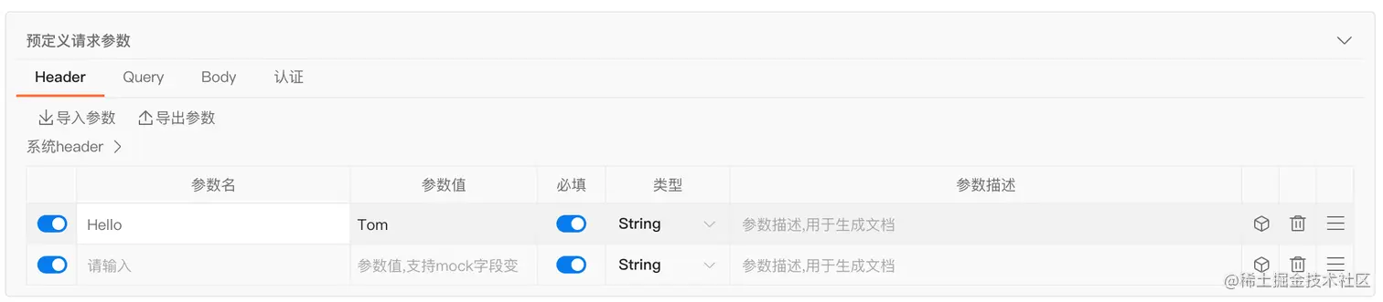 支持header、query、body、认证四项,与API调试模块一致,共用同一份数据源。