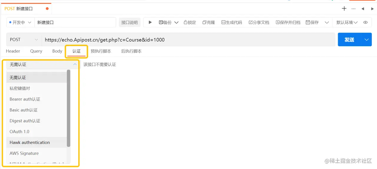 支持Digest auth、OAuth 1.0、Hawk Authentication、AWS Signature、NTML Authentication、Akamai EdgeGrid六种认证方式。