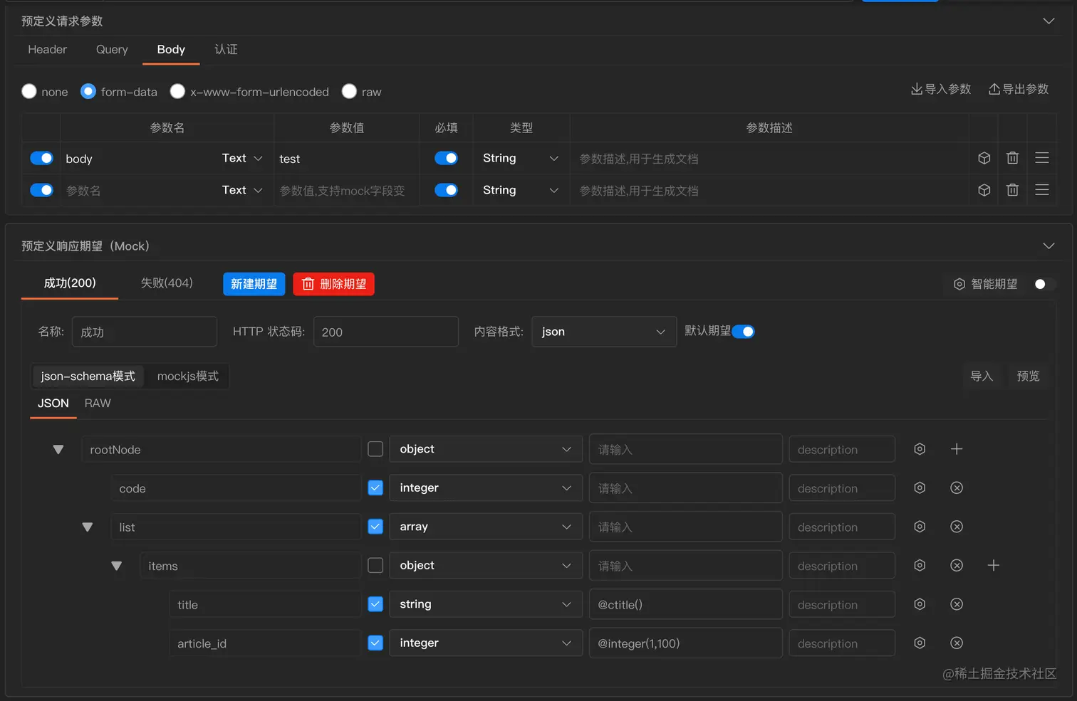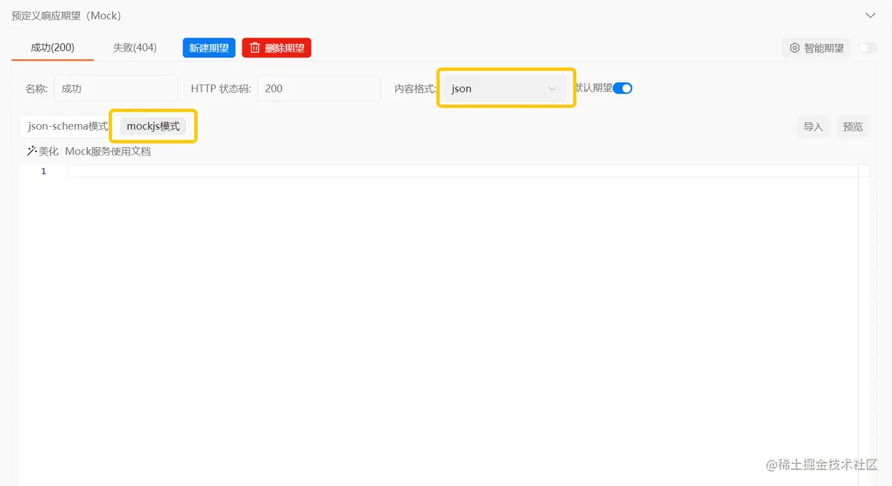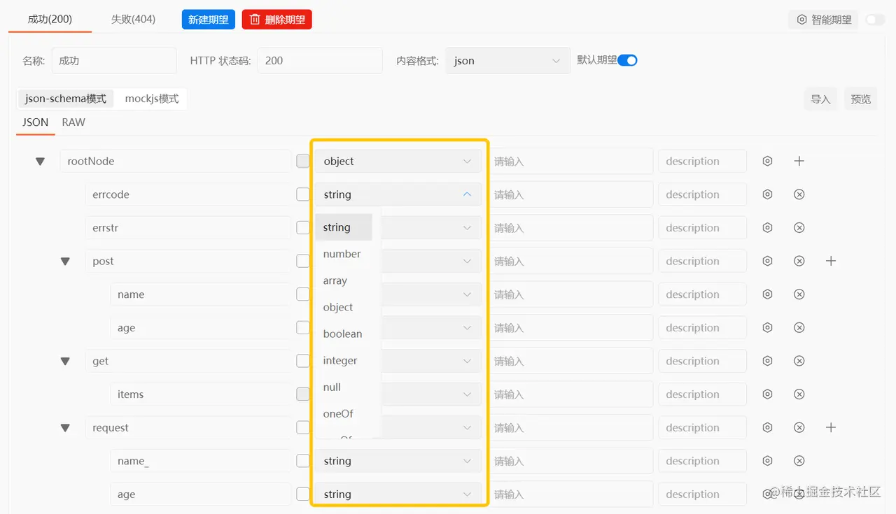 我们可以选择JSON、XML、 HTML、 Raw、 Binary五种内容格式,其中JSON和XML格式可以通过增加字段节点来定义数据结构、字段类型、mock值和参数描述,并支持导入JSON、XML、JSON-schema格式的文件,预览已编辑好的数据,支持刷新生成的数据。 1、JSON格式:该格式的响应内容支持json-schema、mock.js两种各自独立的数据模式,我们可以选择一种方式建立期望,数据结构保存后,可以在响应示例中引用。
