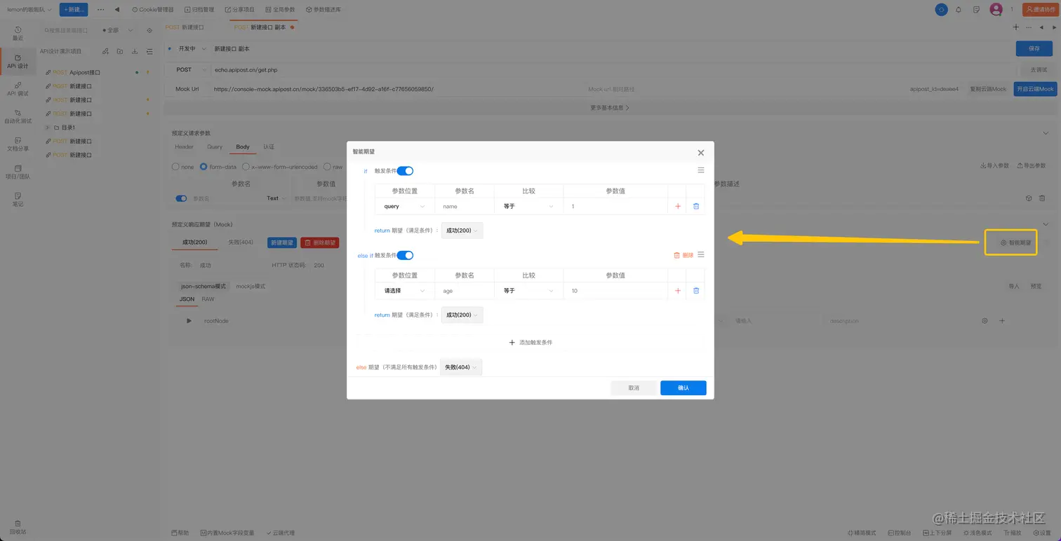 我们可以在智能期望中填写一些触发条件,并设置当满足/不满足该触发条件后,所启用的期望。开启智能期望后,Apipost会根据已设置的触发条件,匹配旗下的参数判断规则,若满足条件,则会启用预设的期望。