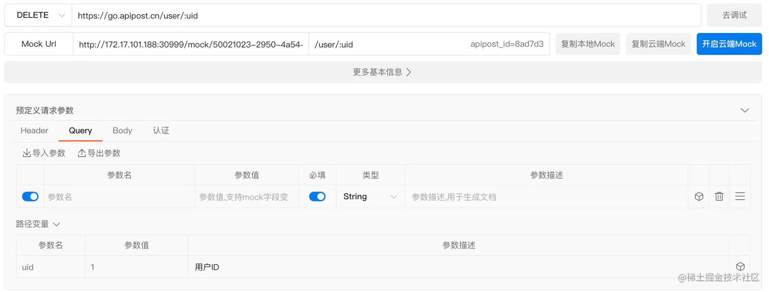 Query 支持构造URL参数,同时支持 RESTful 的 PATH 参数(如图中 :uid)