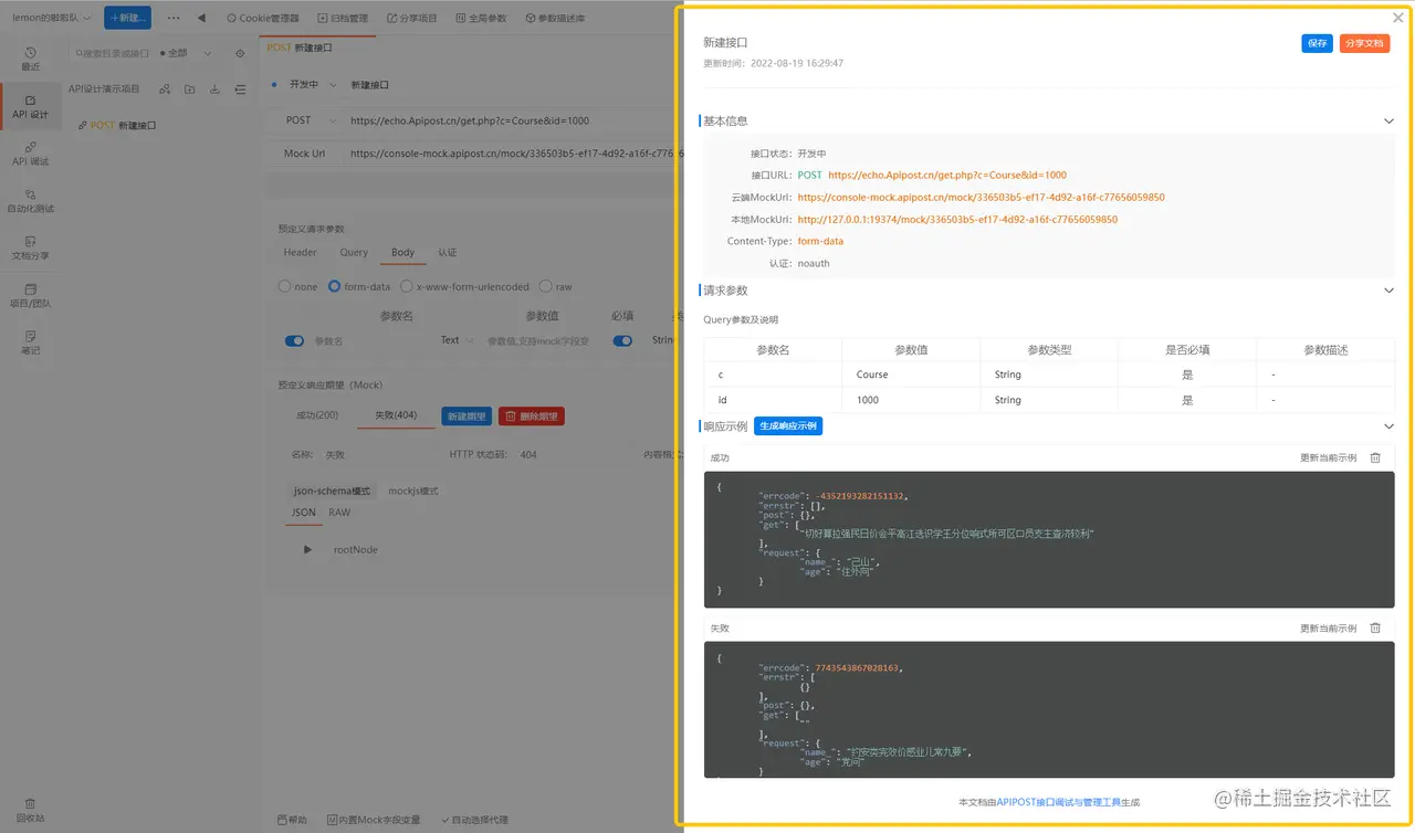 我们可以在Apipost的API设计模块预定义接口的 请求参数 和 响应期望(Mock),方便前端提前对接。如下图: