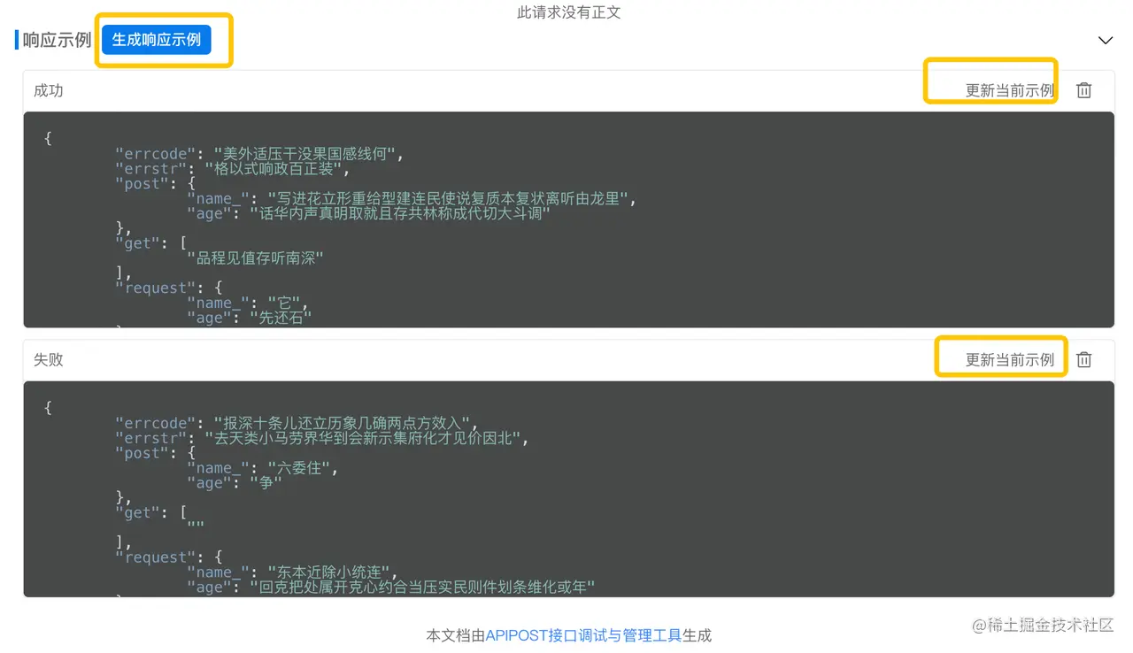 2、更新示例:点击每个响应示例右侧的“更新”按钮,则会更新为最新的响应示例。