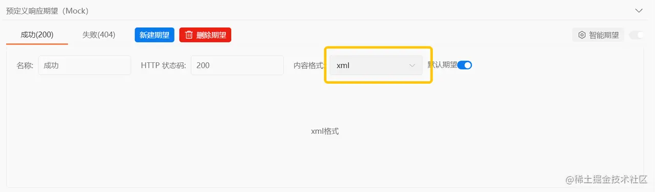 在同一个接口里,由于我们对不同场景下返回的数据结构期望不同,我们可以通过设置多个期望的方式,来满足这个需求。 如图,点击【新建期望】即可打开新建期望的弹窗。我们可以选择该期望的状态码、填写期望名称、选择内容格式,填写触发条件(非必填),最后点击保存,该期望创建成功。