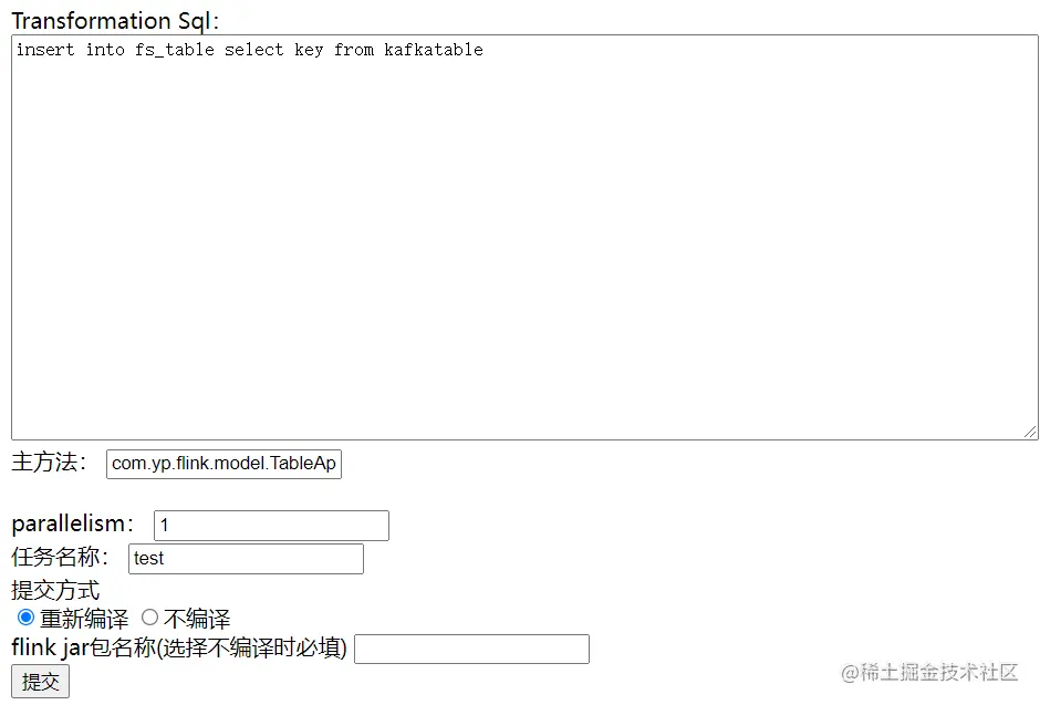 2.然后提供一个页面,传入flink集群参数,mainclass,parallelism等,以及业务参数,主要是sourceSql,sinkSql,transformationSql。然后后台提供一个Flink任务的模板,将sourceSql,sinkSql,transformationSql这三个参数替换掉。再编译成class并生成jar包。
