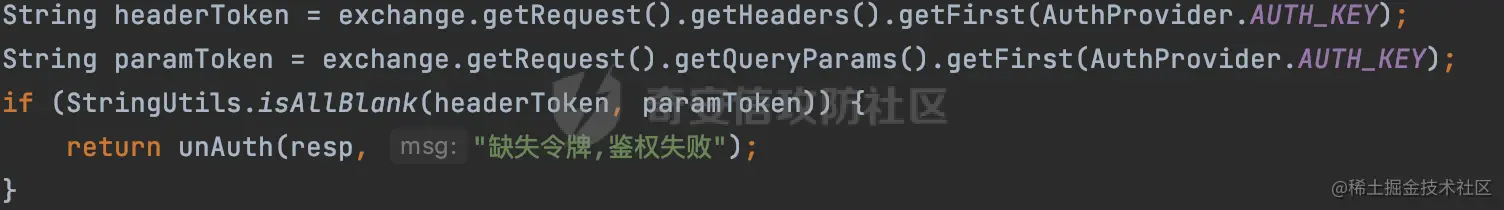 (2)回到AuthFilter,接下来通过两种方式获取token,如果两者都为空时,则提示“缺失令牌,鉴权失败”。