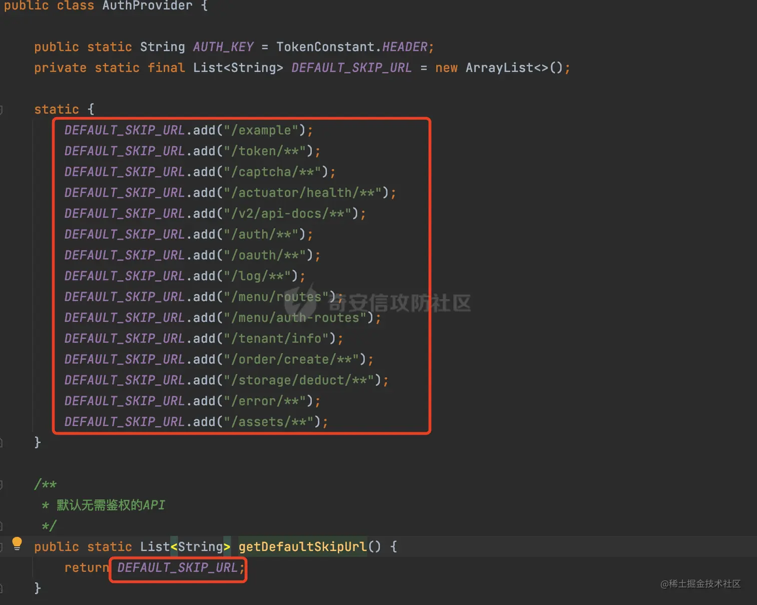 判断路径是否在不需要认证的名单中,跟进getDefaultSkipUrl函数,看不需要认证的名单有哪些: