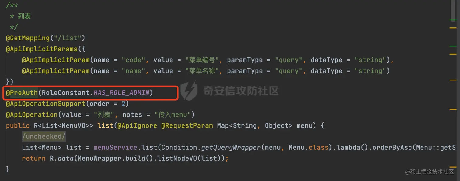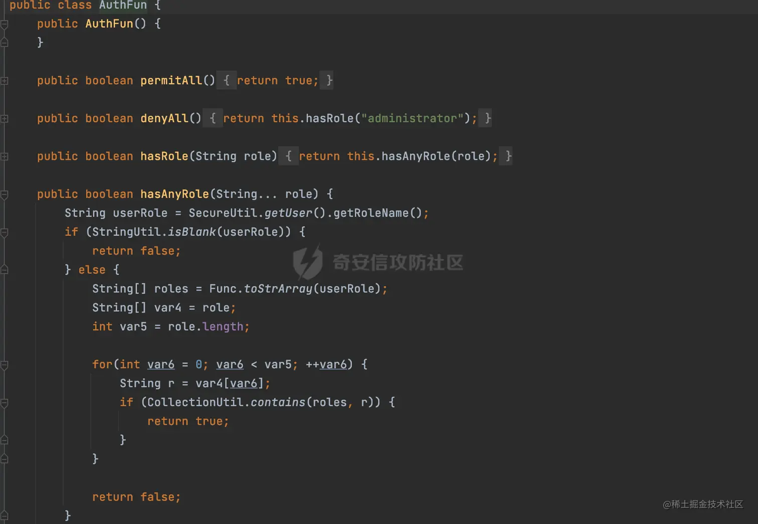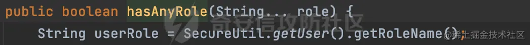 调用了hasRole函数进行鉴权,找一下hasRole实现方式:(实现代码在:org/springblade/blade-core-secure/3.0.2/blade-core-secure-3.0.2.jar!/org/springblade/core/secure/auth/AuthFun.class)