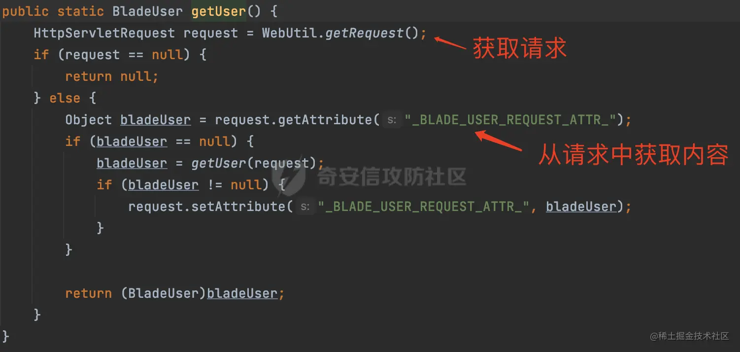 从web容器内部获取BLADE_USER的相关属性,如果没获取到的话,则会使用另外一个getUser方法,实现如下: