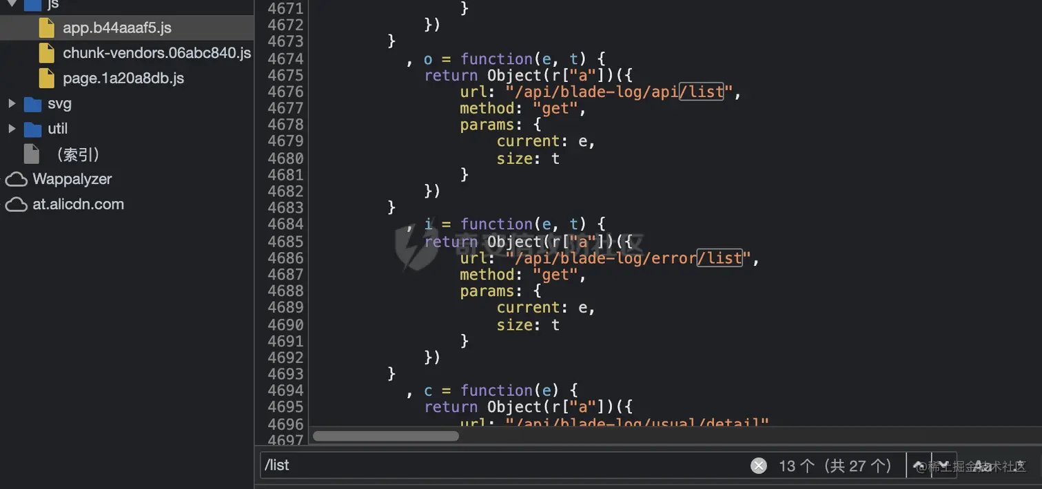2、部分情况下接口的前缀会被改,blade部分,可以从前端的app.js里面看得到完整接口。