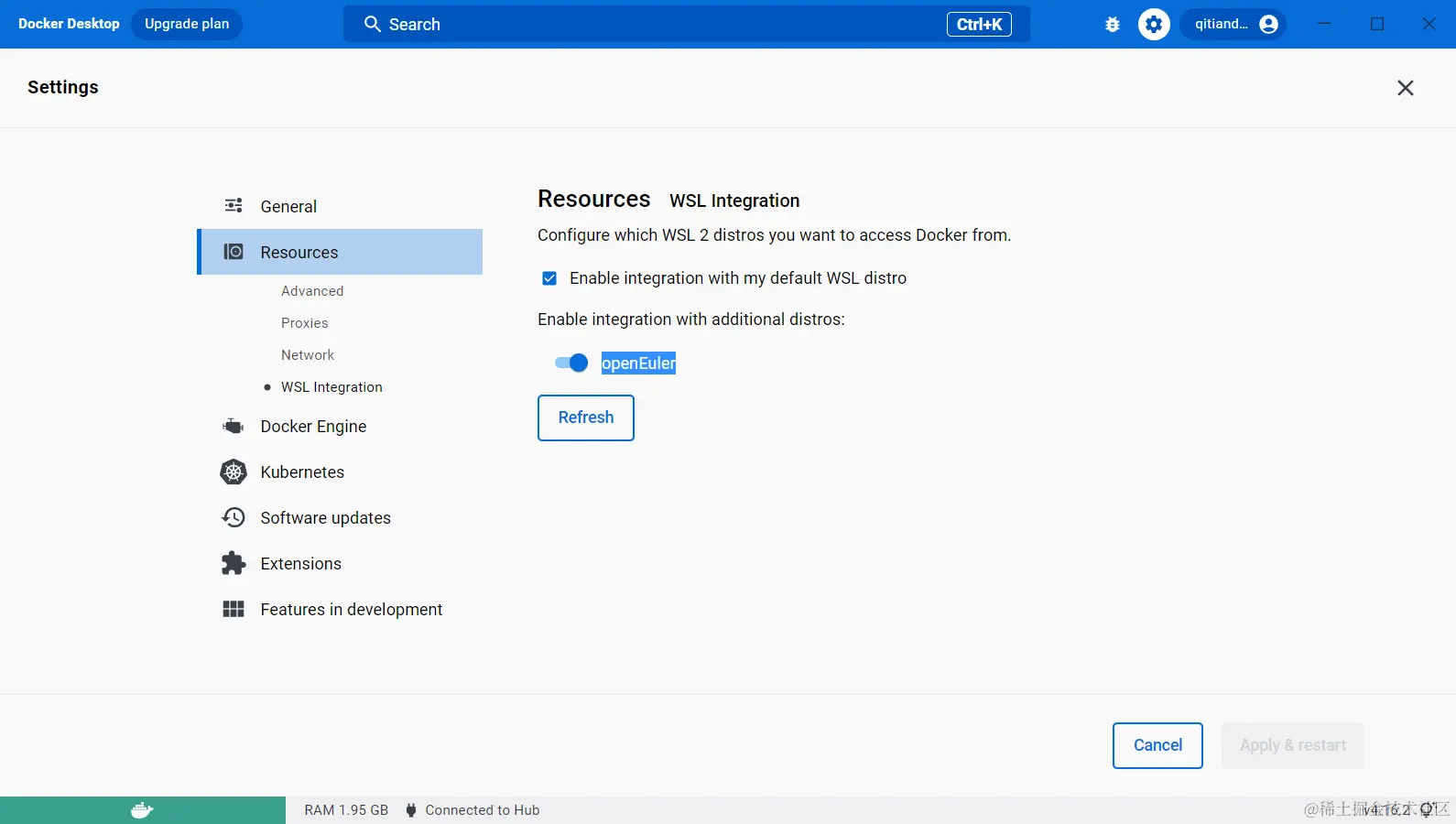 在 Resources 的WSL Integration中设置要从哪个 WSL2 发行版中访问 Docker,如下图使用的是openEuler