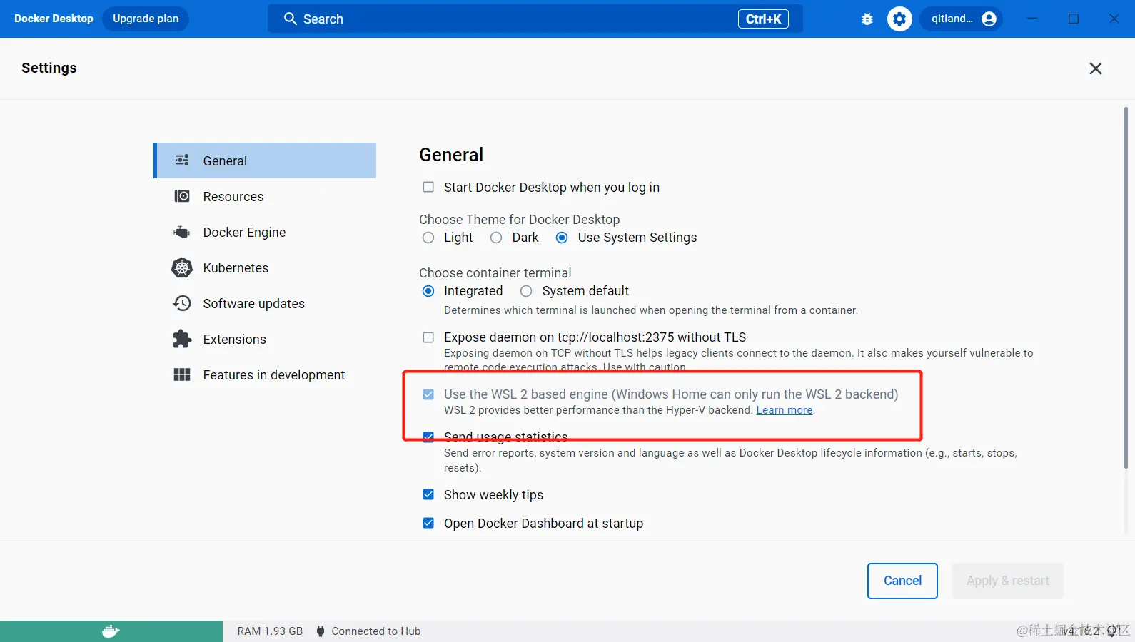 启动Docker Desktop for Windows,点击“设置”按钮,启用基于WSL2的引擎复选框(Use the WSL 2 based engine)