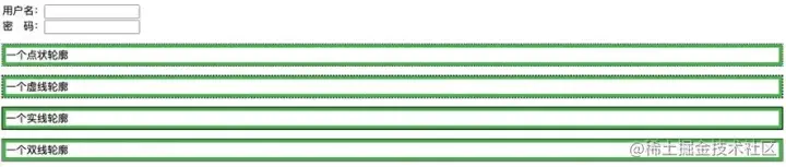 这个轮廓线是通过给 input 元素添加 border 边框实现的吗?仔细观察,轮廓线向外延伸了,但是父元素 div 的高度并没有发生变化。可见,这个轮廓线不是通过 border 实现的。
