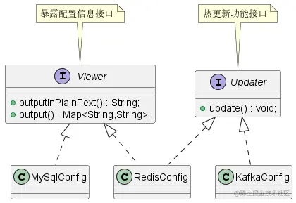 上面的接口设计中,Config 接口中包含两类不相关的功能,一类是热更新 update(),一类是暴露配置给 Web 端方法 output() 和outputInPlainText() 。从理论上说, KafkaConfig 只需要实现热更新功能, MySqlConfig 只需要将配置信息暴露给 Web 端。但是上面这种接口设计, Config 实现类全部都需要实现热更新和配置信息暴露功能;此外,如果需要在 Config 接口中添加新功能,所有的实现类都需要改动,因此这种接口设计是不合理的。