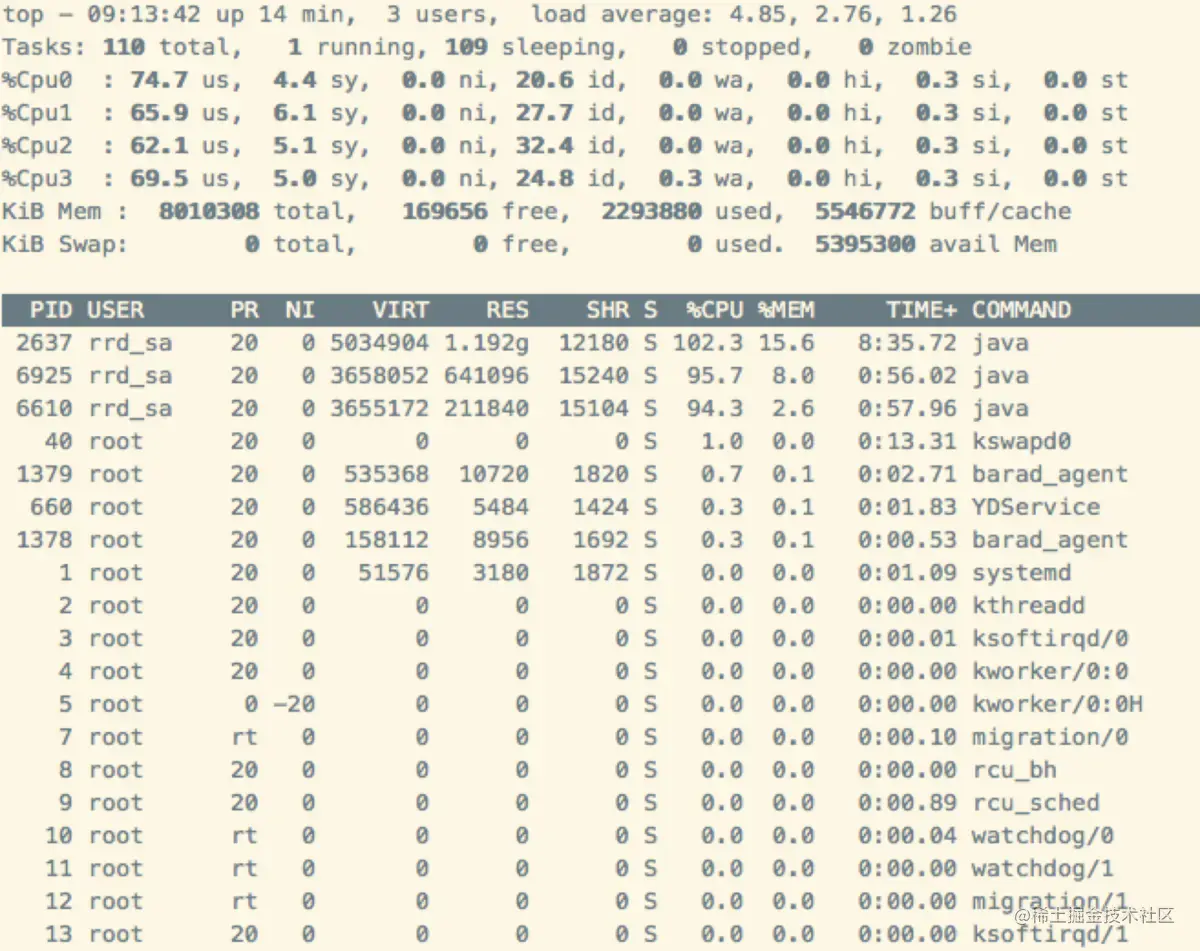你不要认为这是 CPU 的真实使用率,这列值的真实含义是进程使用的所有 CPU 的平均使用率,只是 top 命令在显示的时候转换成了单个CPU。因此,如果是在多核的主机上,这个值就可能会超过 100。在这个例子中,我的主机有 4 个 CPU 核,总 CPU 使用率是 102.3,那么,平均每个 CPU 的使用率大致是25%。