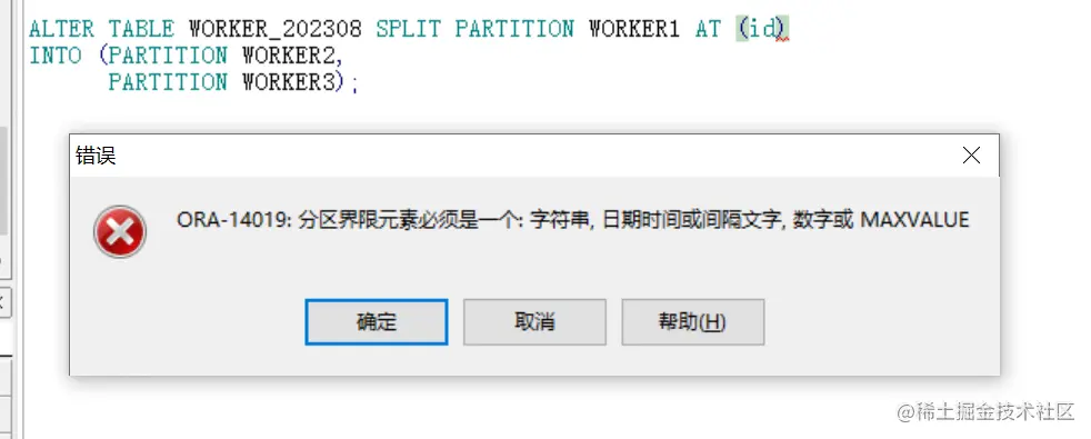 5、将一个分区拆分成多个分区,分区界限元素必须是一个:字符串,日期时间或间隔文字。
