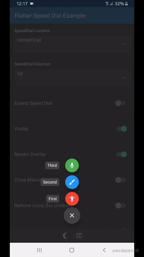 Flutter 自带的 FloatingActionButton 为我们提供了一个悬浮在顶部的按钮,这个按钮始终在最顶层,因此可以做一些快捷的操作。比如,滚动列表时点击该按钮回到顶部。然而,如果我们有多个操作需要悬浮在顶部的时候,一个 FloatingActionButton 就不够了。这个时候也不适合将多个按钮同时悬浮在页面顶部,那就需要点开一个 FloatingActionButton 再弹出更多操作来。这个实现还挺复杂的,不过已经有人帮我们搞定了。这就是增强版的 FloatingActionButton —— SpeedDial 组件,组件地址:flutter_speed_dial。下面是SpeedDial组件的官方示例运行效果。