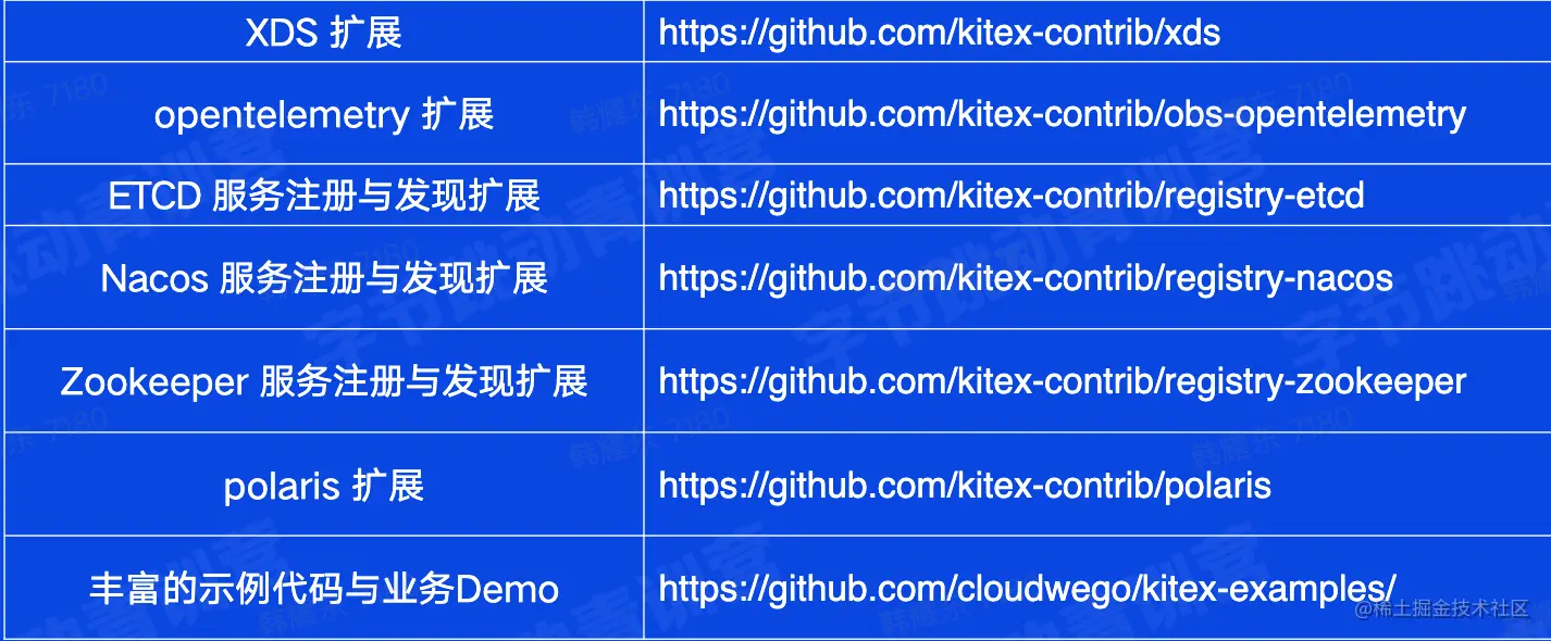 - Kitex 是字节内部的 Golang 微服务 RPC 框架,具有高性能、强可扩展的主要特点,支持多协议并且拥有丰富的开源扩展