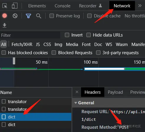 进入彩云小译fanyi.caiyunapp.com ,输入hello点击翻译,然后右键检查找到Network,过滤选择All,找到HTTP的post类型的请求(dict),也可点击Preview浏览请求内容。