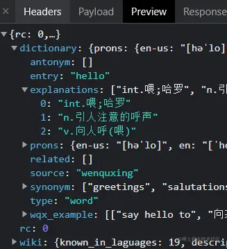 请求的 header 的相当的复杂,有十来个。然后请求头是一个 json 里面有两个字段,一个是代表你要你是从什么语言转化成什么语言, source 就是你要查询的单词。 API 的返回结果里面会有 Wiki 和 dictionary 两个字段。我们需要用的结果主要在dictionary.Explanations 字段里面。其他有些字段里面还包括音标等信息。